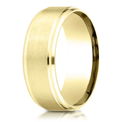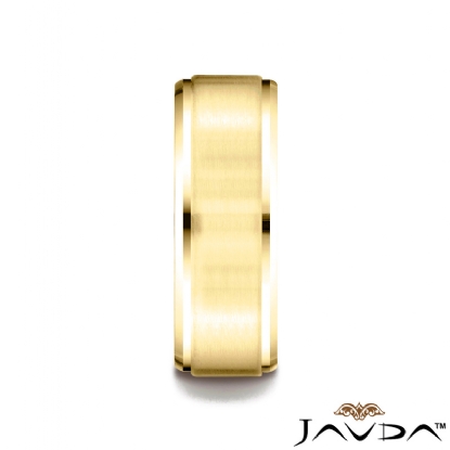 This 8mm comfort fit unisex carved wedding band features a satin finished center along with drop beveled edges. The classic wedding ring for men's and women's is comfortable to wear everyday. This ring is long lasting and perfect choice to celebrate an wedding day, or an anniversary, made from 14k Gold Yellow. Available in white gold, yellow gold and rose gold.