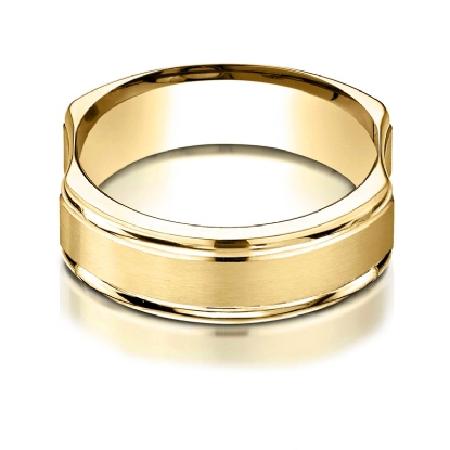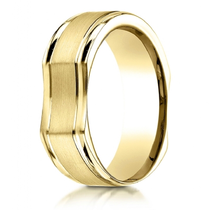 This bone style unisex comfort fit carved wedding band features a satin finished center along with polished round edges. This unique wedding ring for men's and women's is long lasting and comfortable to wear everyday. Made from 14k Gold Yellow, measures 7mm wide. Available in white gold, yellow gold and rose gold.
