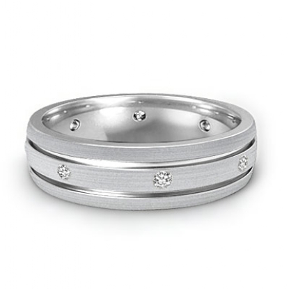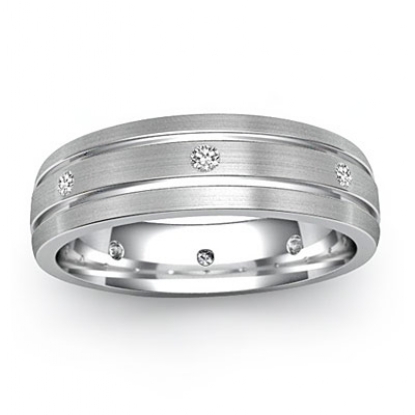 Modern handcrafted diamond eternity men's wedding band made from solid 14k Gold White. Featuring brushed finish and parallel grooved with round diamond in a bezel setting.