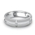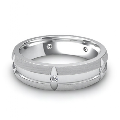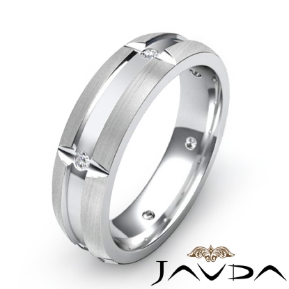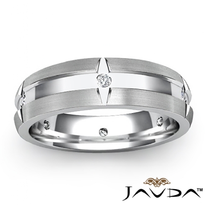 A stylish diamond eternity men's wedding band made from solid 18k Gold White. This wedding ring showcasing brushed finish beveled edges with round cut diamonds in a bezel setting.