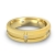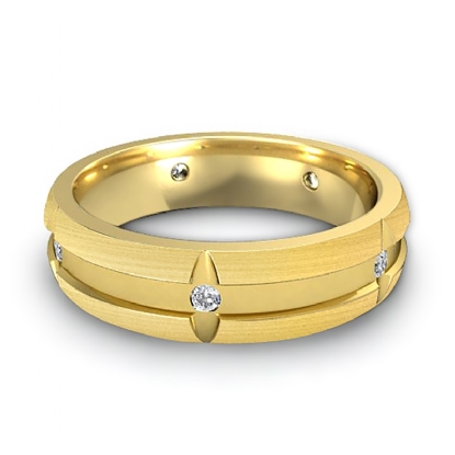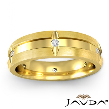 A stylish diamond eternity men's wedding band made from solid 18k Gold Yellow. This wedding ring showcasing brushed finish beveled edges with round cut diamonds in a bezel setting.