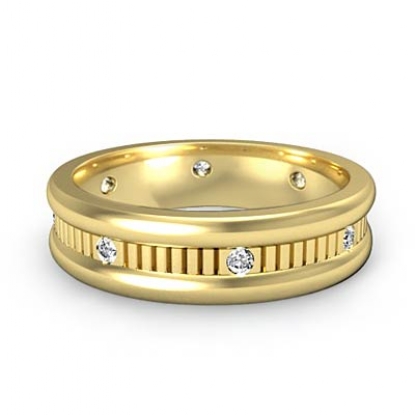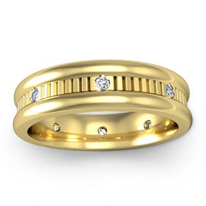 Simple yet unique, this diamond eternity men's wedding band made from solid 18k Gold Yellow. This ring features high polished round edges and vertical cut center with round cut bezel set diamonds.
