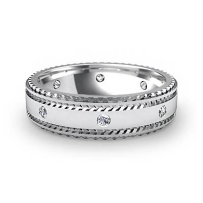 The modern diamond eternity men's wedding band crafted in 18k Gold White. This band featuring polished finish and carved step edges with round cut bezel set diamonds in a center.