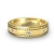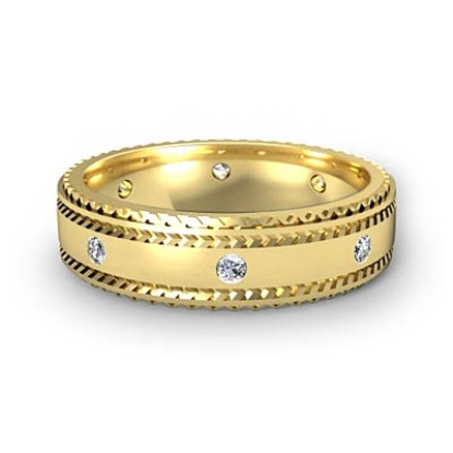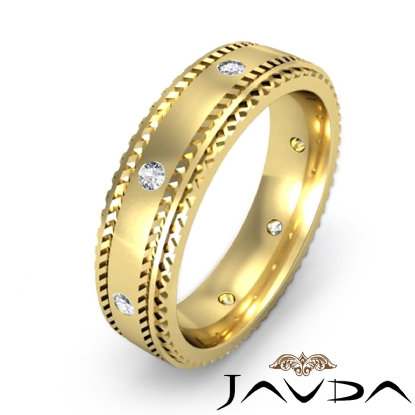 The modern diamond eternity men's wedding band crafted in 18k Gold Yellow. This band featuring polished finish and carved step edges with round cut bezel set diamonds in a center.