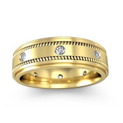 This modern diamond eternity men's wedding band made from 18k Gold Yellow. Featuring polished finish and milgrain step edges with round cut diamonds in a bezel setting.