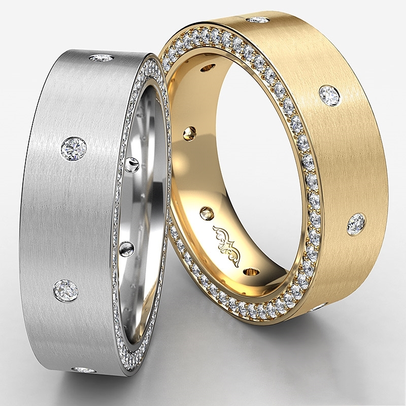 round diamond eternity men's wedding band made from 14k Gold Yellow. This satin finished flat ring features pave set diamonds all around the side of the band and the bezel set on top.
