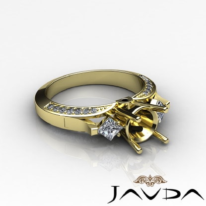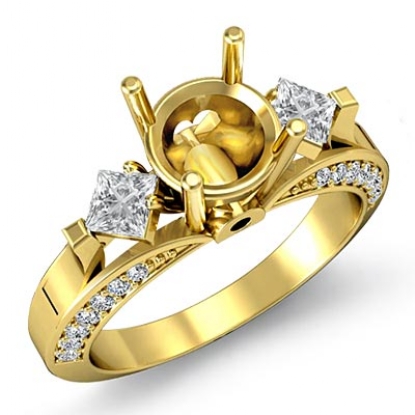 Elegant as ever! This 18k Gold Yellow ring features semi mount round cut center diamond, clustered by two princess side diamonds all in prong setting. Pave set