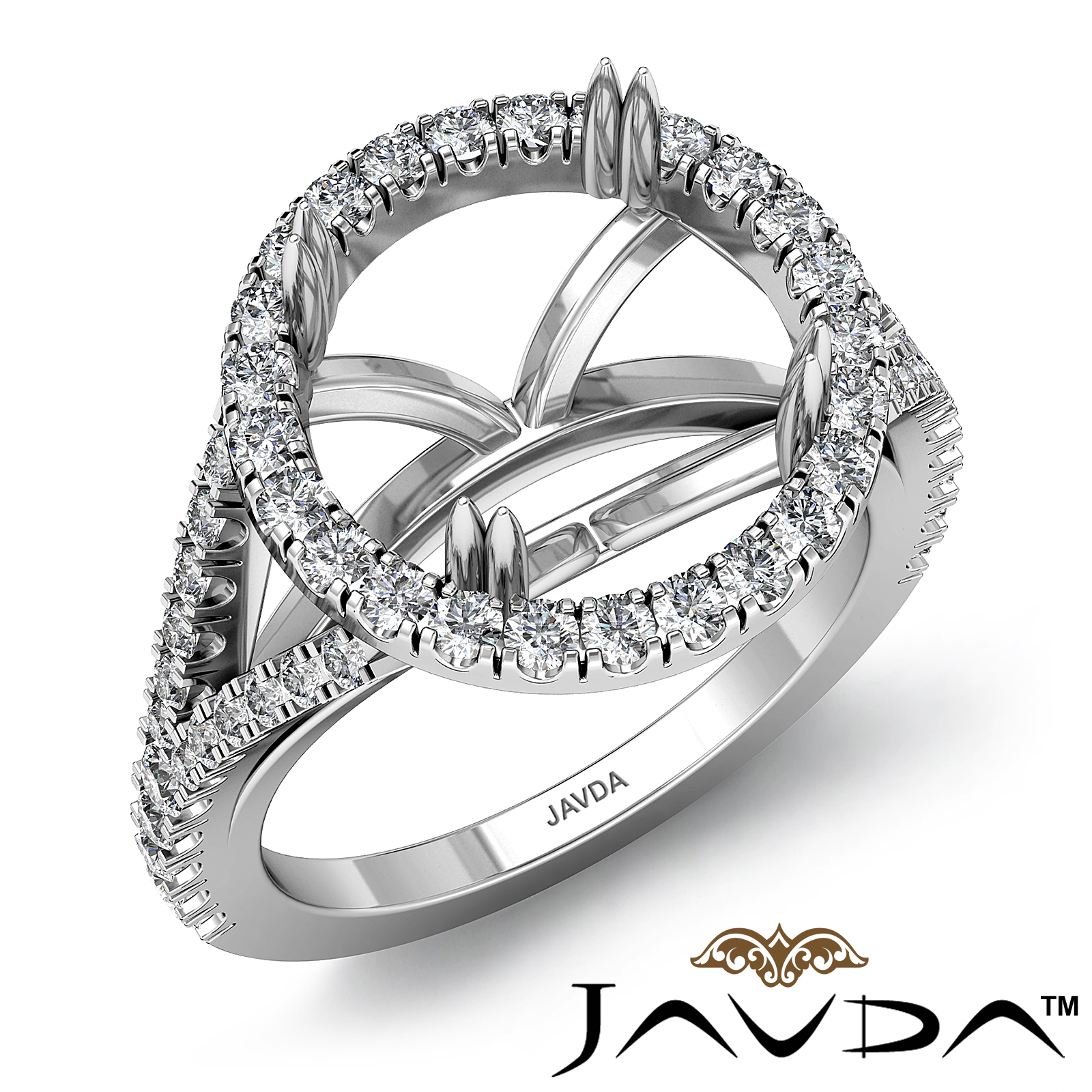 Elegant U split prong halo round semi mount engagement ring made from 18k Gold White. This diamond ring features total round diamonds along the shank and halo in a split prong setting.