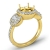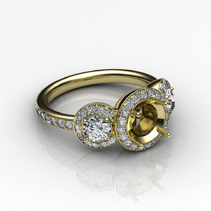 Triple the diamonds for limitless shine! This semi mount engagement ring features round halo diamonds that frame the center and side stones, with pave set diamonds on the shank. This ring is made in