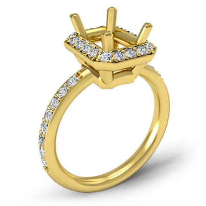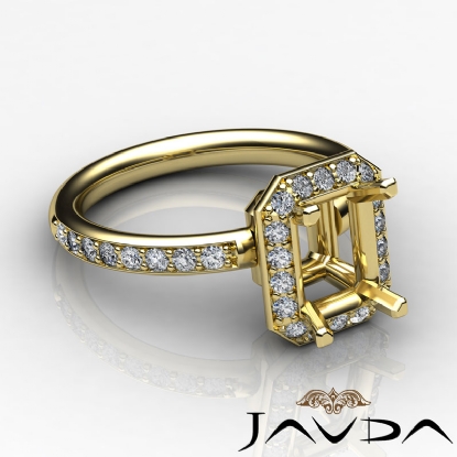 This strikingly sophisticated 18k Gold Yellow engagement ring showcases an emerald semi mount. It has pave set round diamonds in halo & around the shank that total (0.56Ct. tw.)