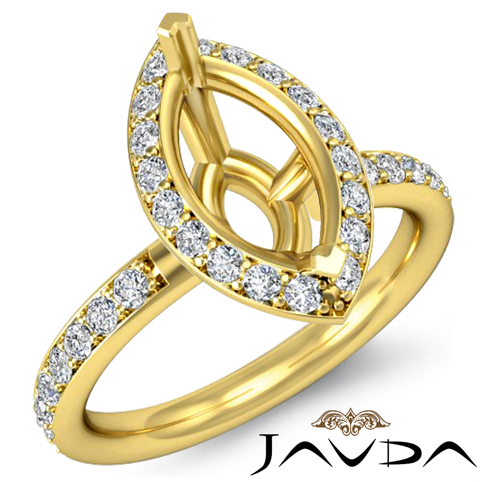 Forever timeless, this luxurious 18k Gold Yellow engagement ring has a marquise semi mount. It displays pave set round diamonds in halo & along the shank. (0.51Ct. tw.)