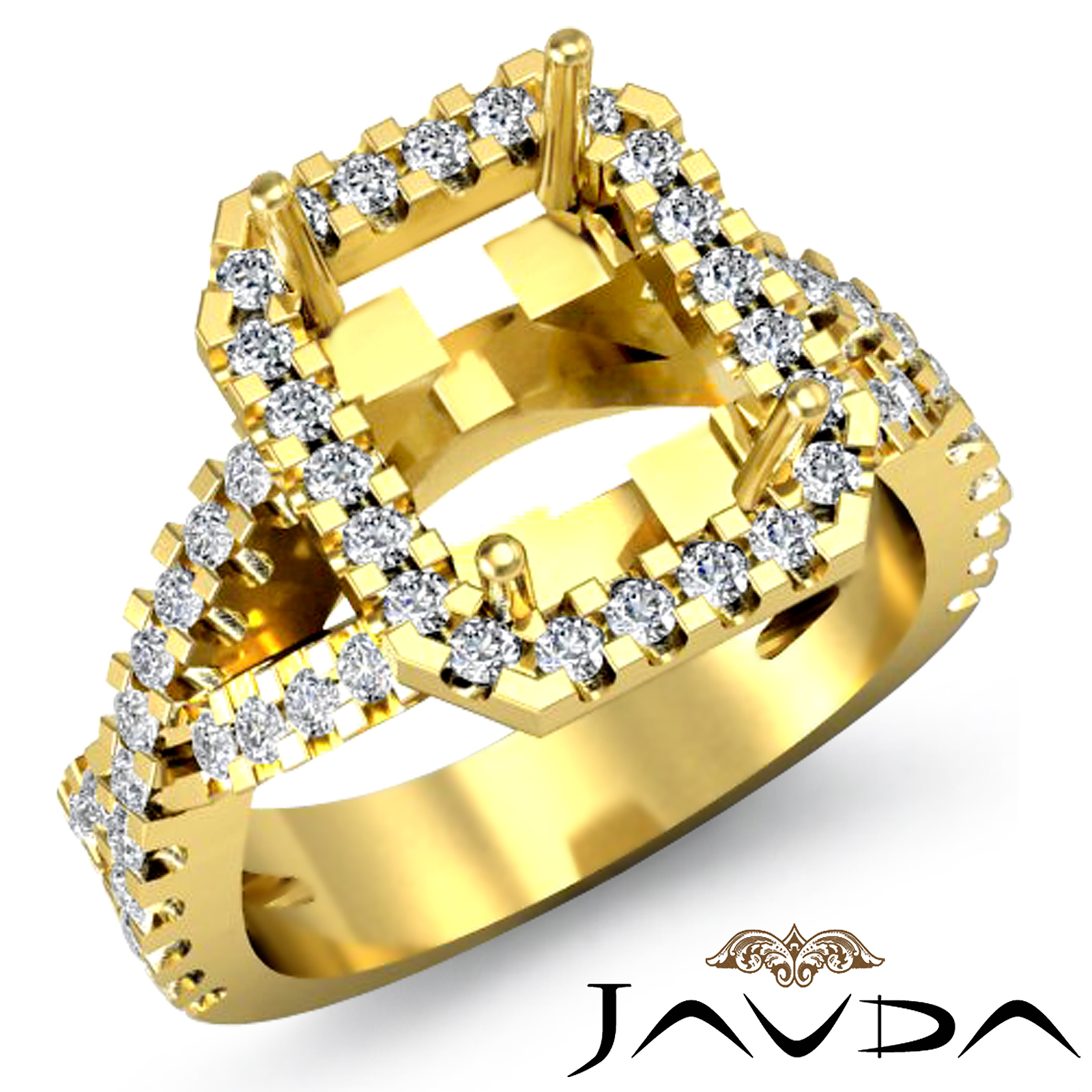 Lavishly curved and showcasing your center semi mount with brilliance, this diamond engagement ring is made in 14k Gold Yellow. It showcases a radiant semi mount, with prong diamonds on halo and split shank. (1Ct. tw.)