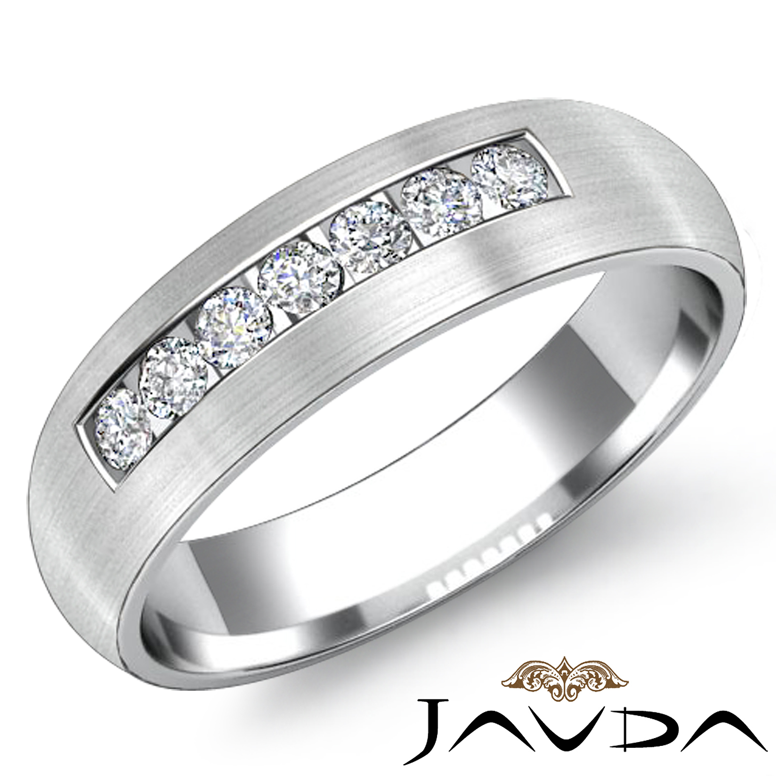 A matte finish round diamond men's half wedding band is made from quality 14k Gold White. Featuring dome matte finished band with round diamonds set in a channel setting.