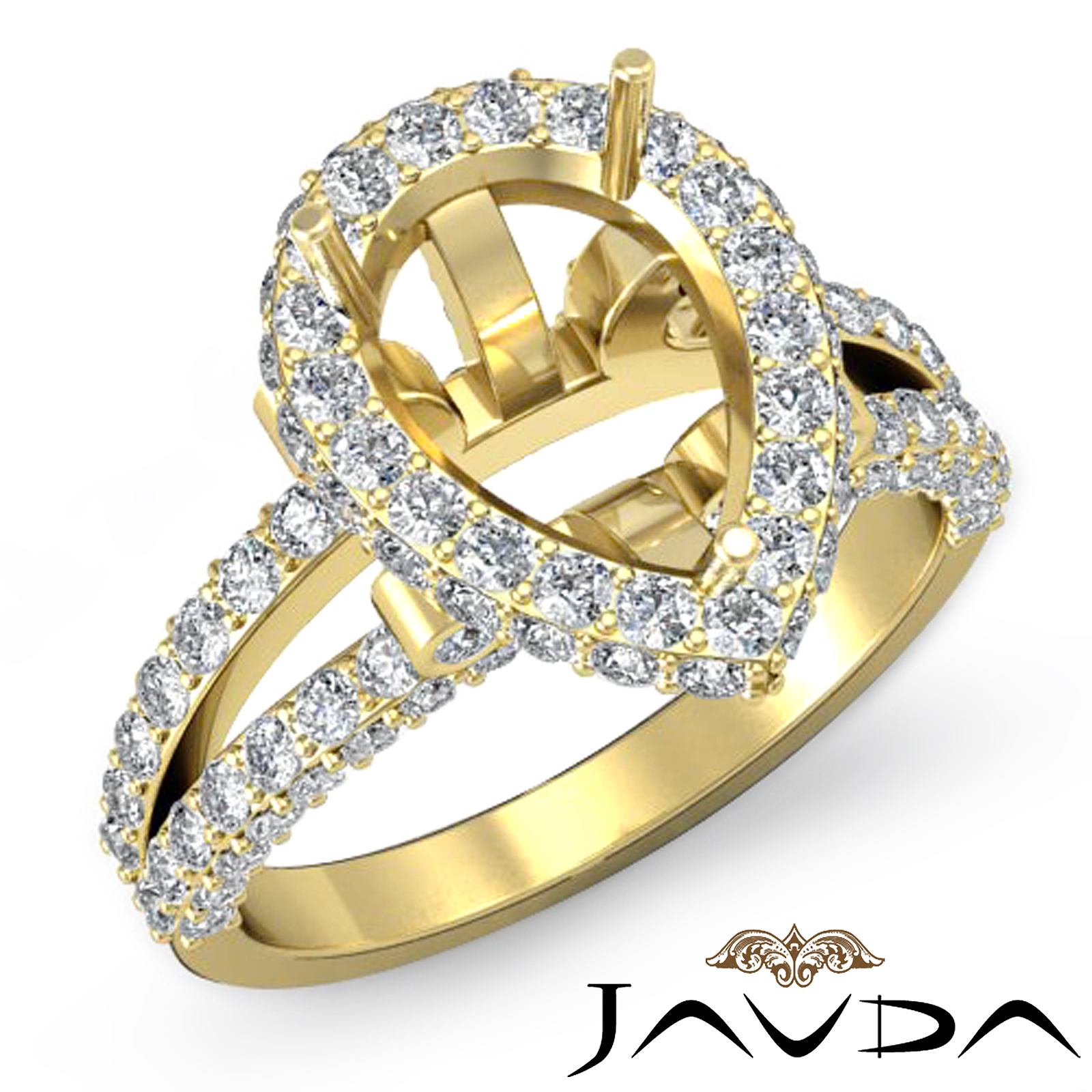 Undeniably striking, this pear semi mount diamond engagement ring is made in 14k Gold Yellow. It displays pave set round diamonds in halo & split shank. (1.52Ct. tw.)