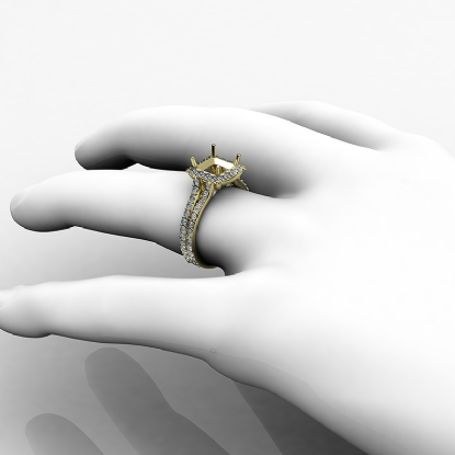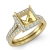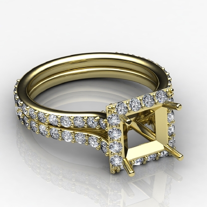 Eyes will be fixated on this one! This princess semi mount engagement ring is made in 14k Gold Yellow. It displays pave set round diamonds in halo & along the shank. (1.38Ct. tw.)