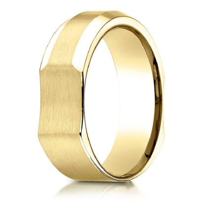 This stunning bone style unisex comfort fit wedding band features a satin finished along with beveled edge. Made from 14k Gold Yellow, measures 7mm wide. This unique wedding ring for men's and women's is comfortable to wear everyday. Available in white gold, yellow gold and rose gold.