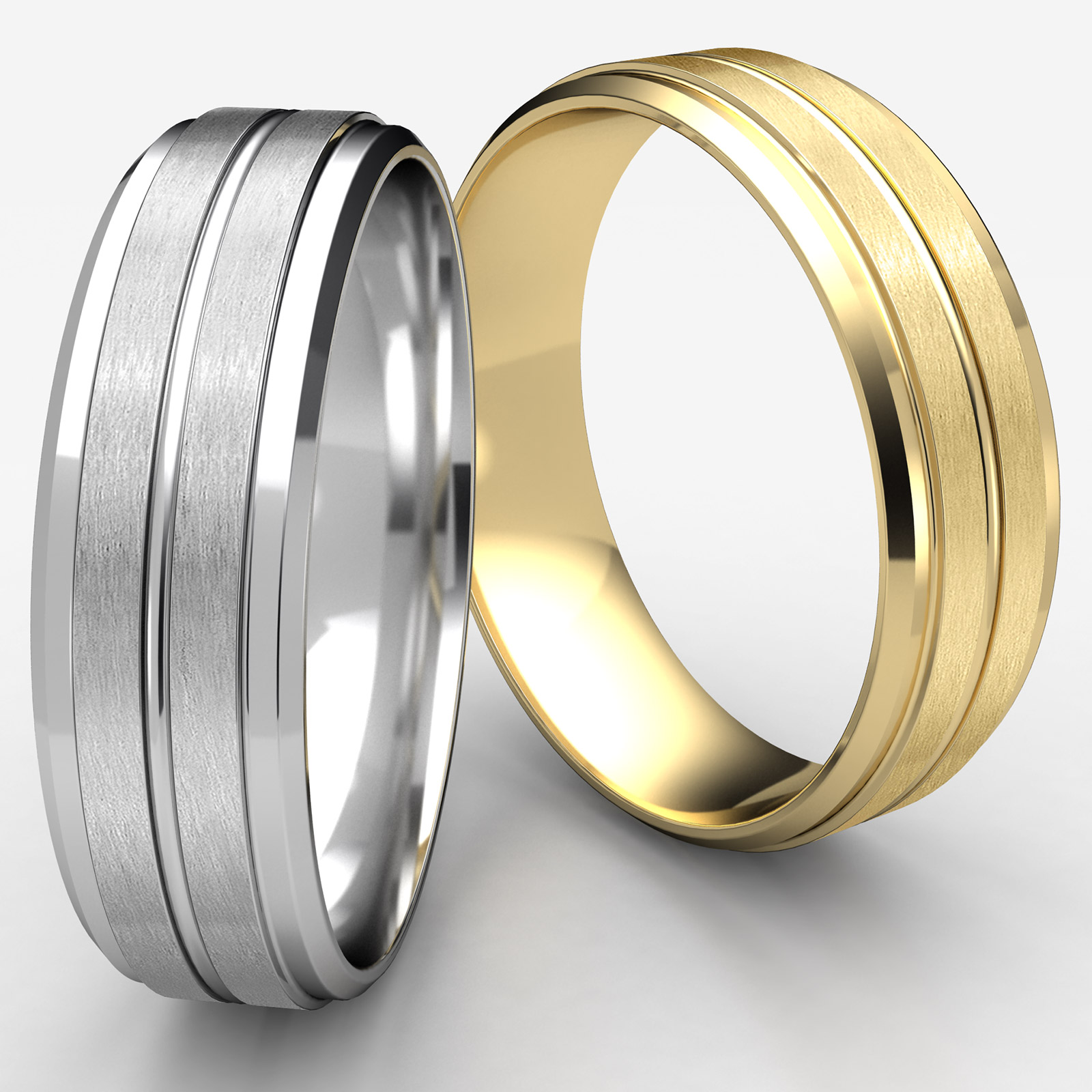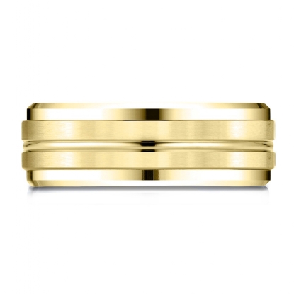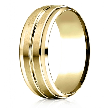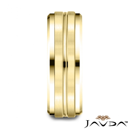 The comfort fit wedding band features a satin finished strips with high polished center cut and drop beveled edges. Made from 14k Gold Yellow, measures 8mm wide. This solid wedding ring for men's is long lasting and comfortable to wear everyday. Available in white gold, yellow gold and rose gold.