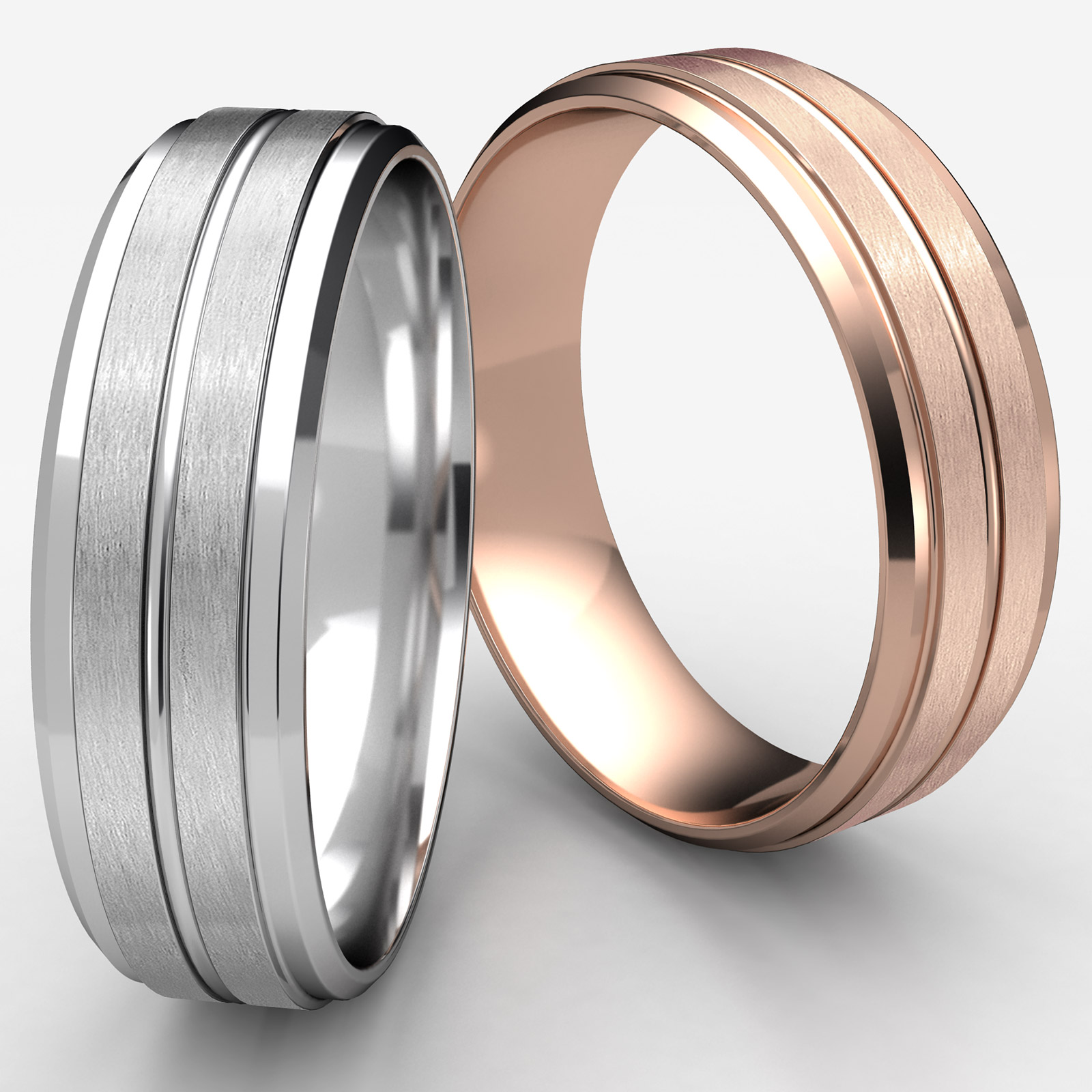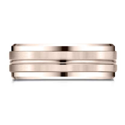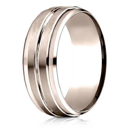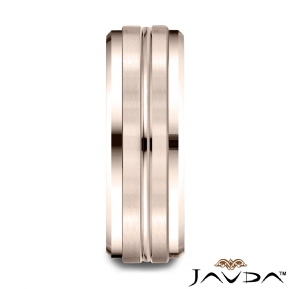 The comfort fit wedding band features a satin finished strips with high polished center cut and drop beveled edges. Made from 14k Rose Gold, measures 8mm wide. This solid wedding ring for men's is long lasting and comfortable to wear everyday. Available in white gold, yellow gold and rose gold.