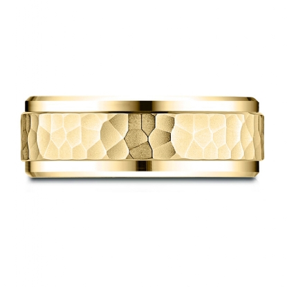This comfort fit unisex carved design wedding band features a hammered finished center with drop beveled edges for a stylish look. Made from 14k Gold Yellow, measures 8mm wide. This delightful wedding ring for men's and women's is comfortable to wear everyday. Available in white gold, yellow gold and rose gold.
