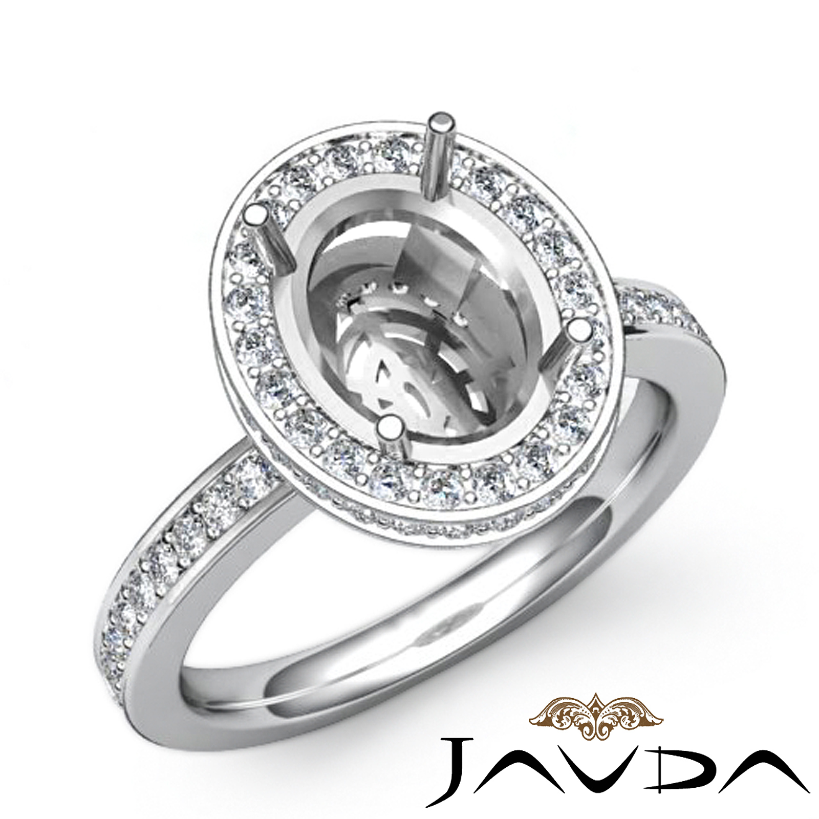 An elegant statement, this oval diamond semi mount engagement ring captures all the romance with pave set round diamonds in halo & along the shank. This ring is made in enduring 18k Gold White. (0.82Ct. tw.)