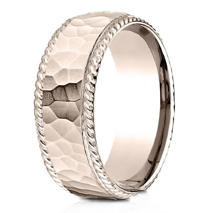 This stunning comfort fit men's carved design wedding band features a hammered finish center design with rope edge. The perfect modern and classy combination of handsome wedding band. Made from 14k Rose Gold and measures 8mm wide. Available in white gold, yellow gold and rose gold.