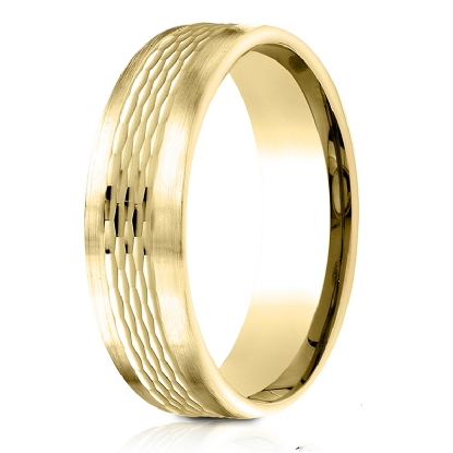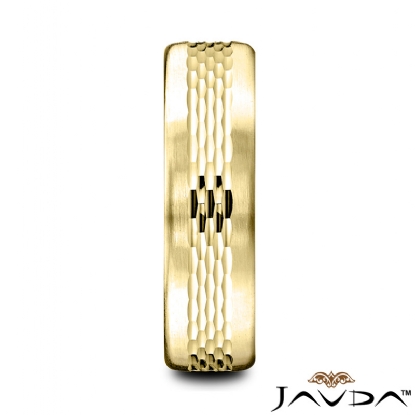 This exquisite 6.5mm width comfort fit unisex carved design wedding band features a satin finished edge along with mesh finish center. The gorgeous wedding band for men's and women's made from 14k Gold Yellow. This wedding ring is long lasting and perfect for everyday wear. Available in white gold, yellow gold and rose gold.