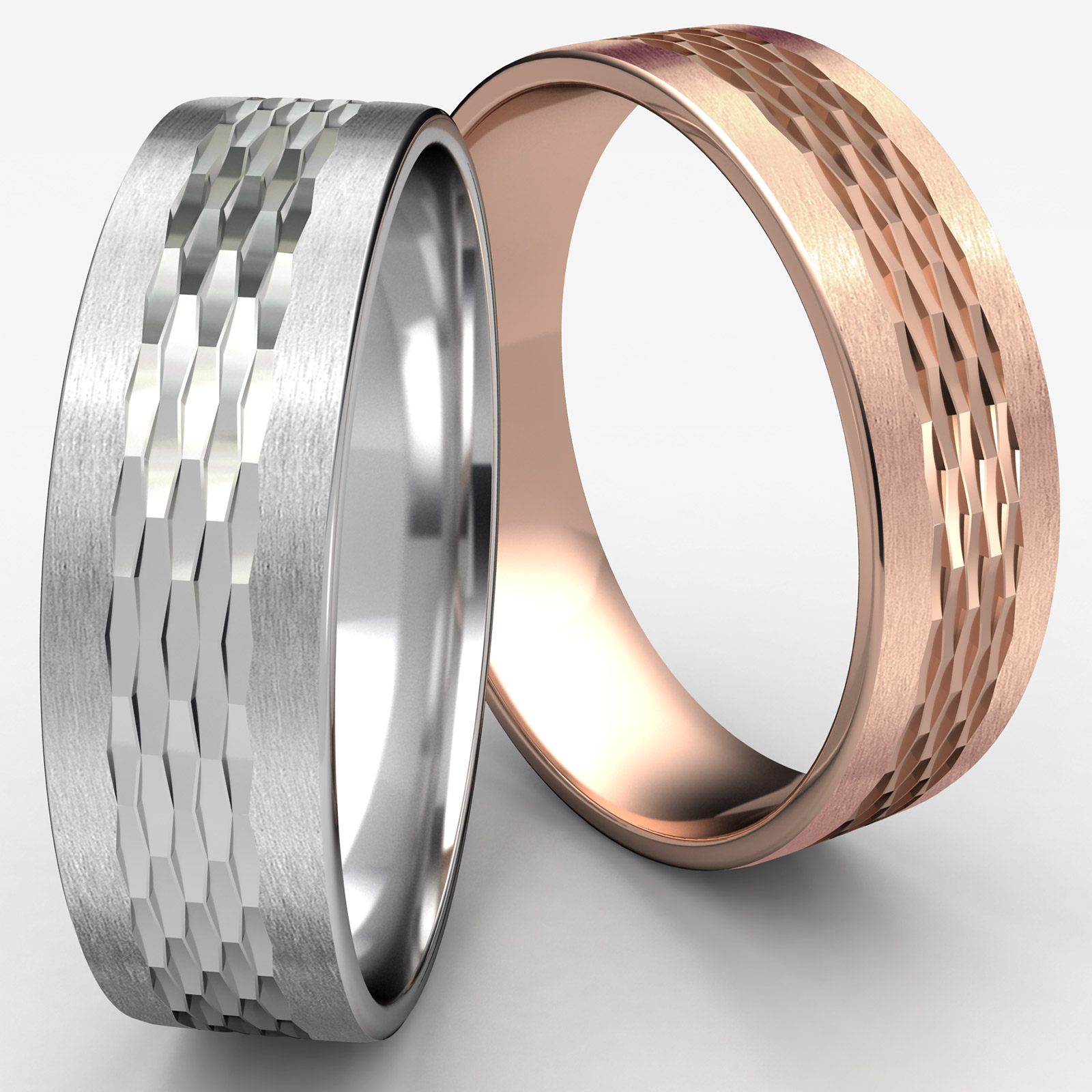 This exquisite 6.5mm width comfort fit unisex carved design wedding band features a satin finished edge along with mesh finish center. The gorgeous wedding band for men's and women's made from 14k Rose Gold. This wedding ring is long lasting and perfect for everyday wear. Available in white gold, yellow gold and rose gold.