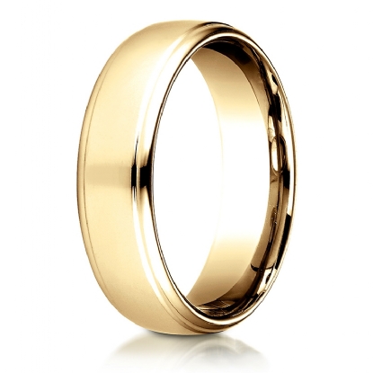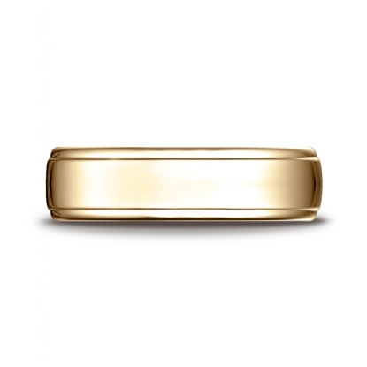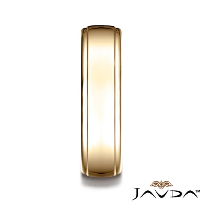 This classic comfort fit men's carved wedding band features a drop edge high polished finish. The solid wedding band for him is made from 14k Gold Yellow, measures 6.5mm wide. This wedding ring is long lasting and perfect for everyday wear. Available in white gold, yellow gold and rose gold.