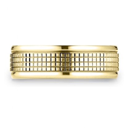 This comfort fit men's carved wedding band features a cross hatch pattern center and high polish round edges. The solid wedding band for him is made from 14k Gold Yellow, measures 7mm wide. This remarkable wedding ring is long lasting. Available in white gold, yellow gold and rose gold.