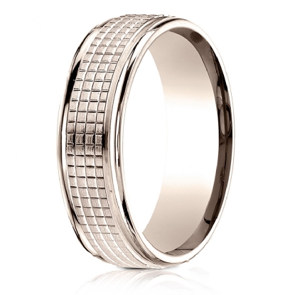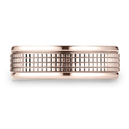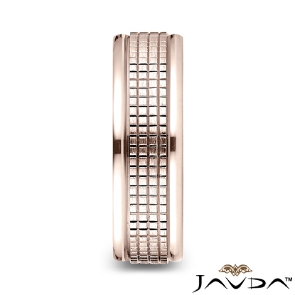 This comfort fit men's carved wedding band features a cross hatch pattern center and high polish round edges. The solid wedding band for him is made from 14k Rose Gold, measures 7mm wide. This remarkable wedding ring is long lasting. Available in white gold, yellow gold and rose gold.