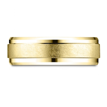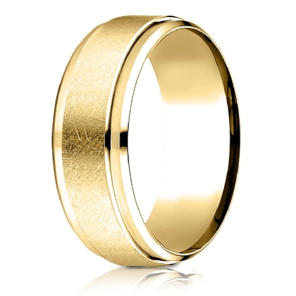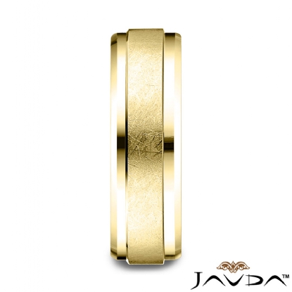This incredible 7mm wide comfort fit carved wedding band features a swirl finish along the center and high polished drop beveled edge. This modern men's wedding band is long lasting and comfortable to wear everyday, made from 14k Gold Yellow. Available in white gold, yellow gold and rose gold.