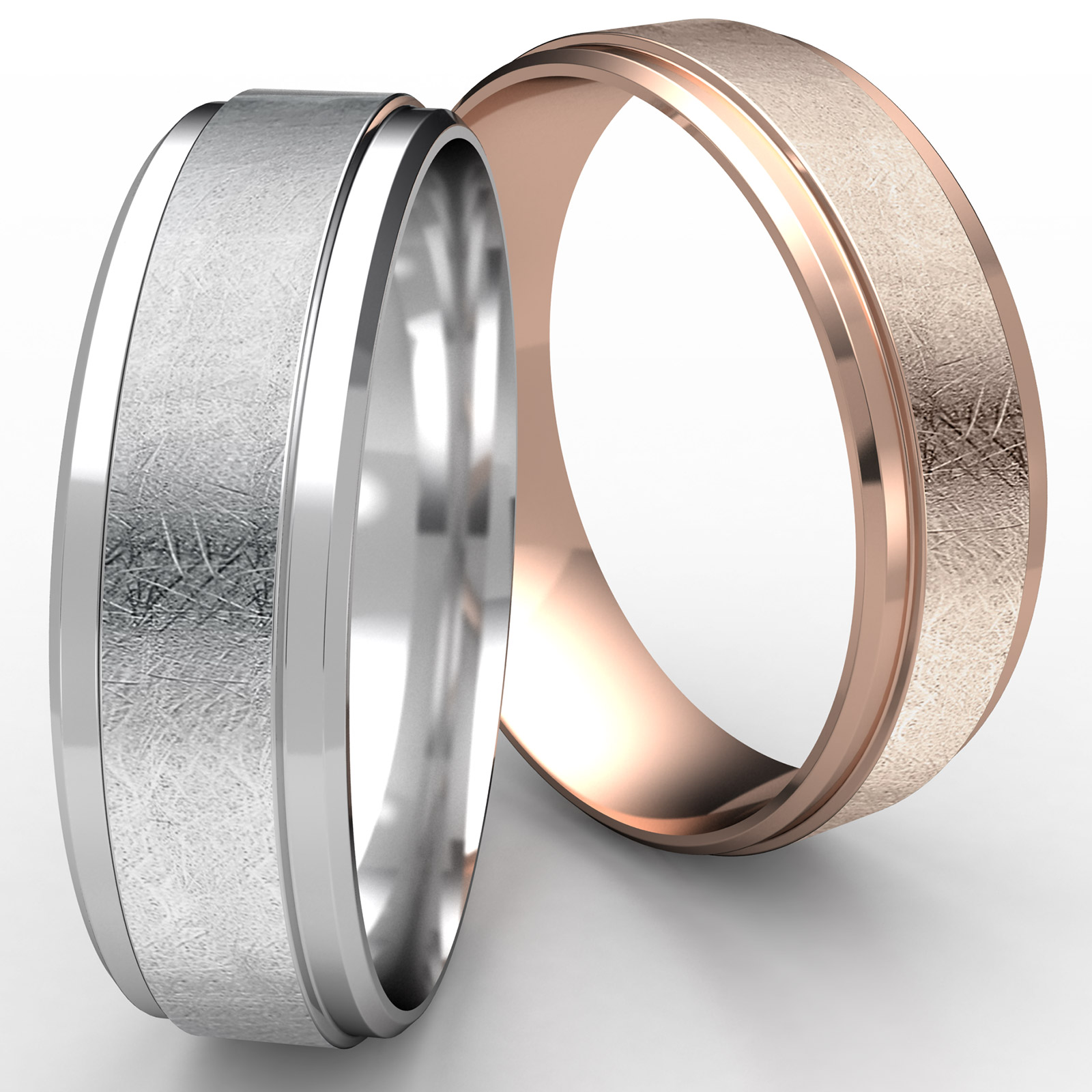 This incredible 7mm wide comfort fit carved wedding band features a swirl finish along the center and high polished drop beveled edge. This modern men's wedding band is long lasting and comfortable to wear everyday, made from 14k Rose Gold. Available in white gold, yellow gold and rose gold.