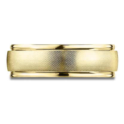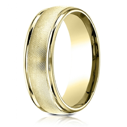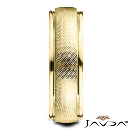 This comfort fit unisex carved wedding band features a florentine center finish with a high polished round edges. This stunning wedding ring for men's and women's is long lasting. Made from 14k Gold Yellow, measures 7mm wide. Available in white gold, yellow gold and rose gold.