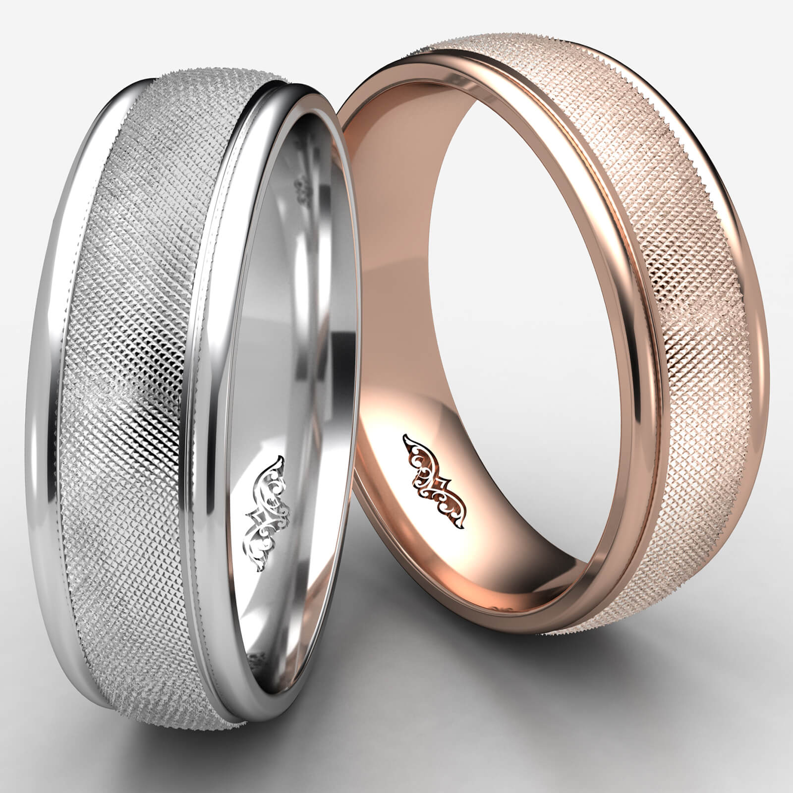 This comfort fit unisex carved wedding band features a florentine center finish with a high polished round edges. This stunning wedding ring for men's and women's is long lasting. Made from 14k Rose Gold, measures 7mm wide. Available in white gold, yellow gold and rose gold.