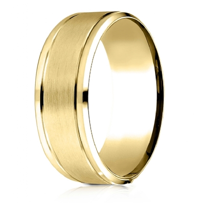 This attractive 8mm wide comfort fit unisex carved wedding band features a satin finished center with a polished drop beveled edges. This solid wedding ring for men's and women's is long lasting and comfortable to wear everyday, made from 14k Gold Yellow. Available in white gold, yellow gold and rose gold.