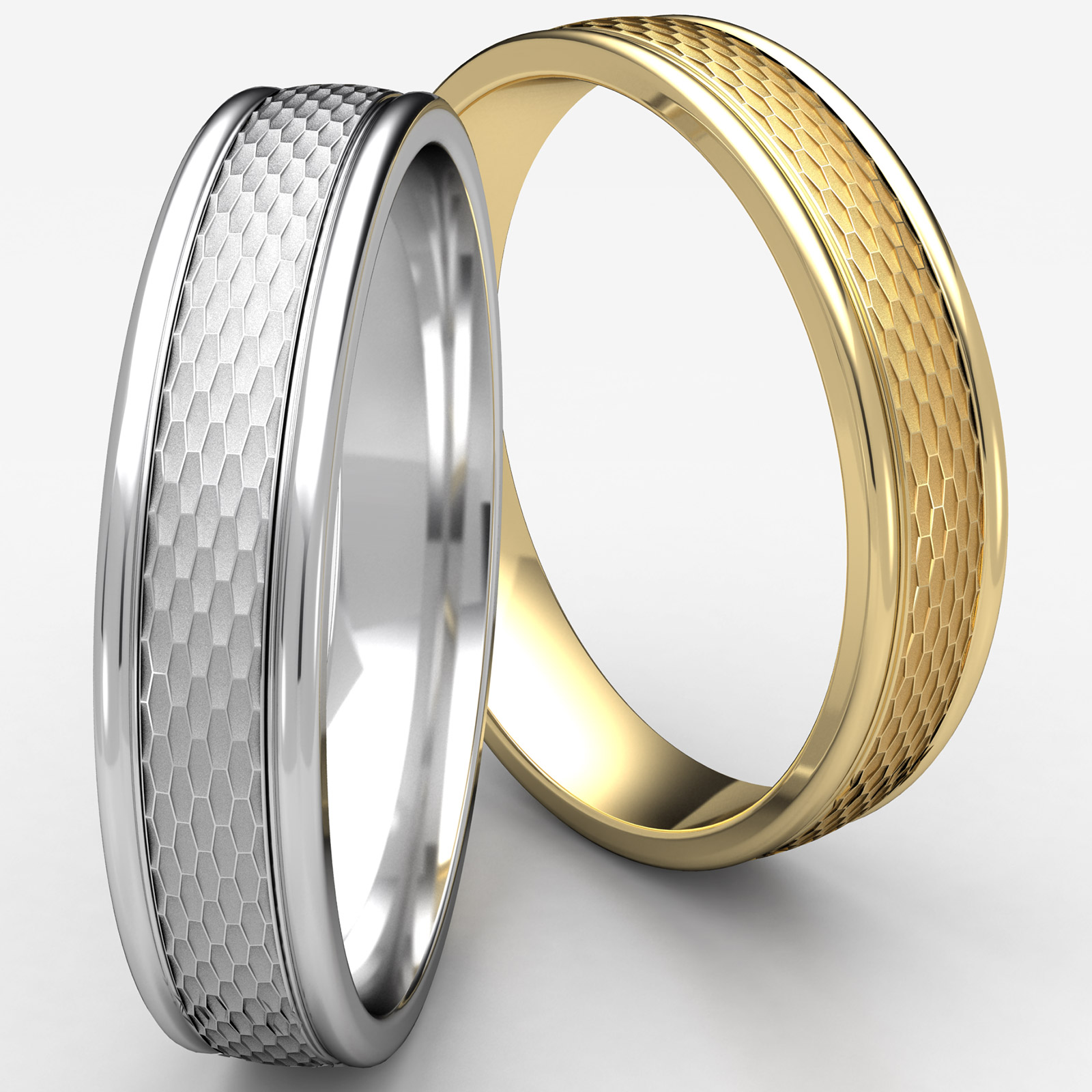 The beautiful 4.5mm wide comfort fit unisex carved wedding band features a mesh finished center with high polished round edges. This stylish wedding ring for men's and women's is long lasting and comfortable to wear everyday, made from 14k Gold Yellow. Available in white gold, yellow gold and rose gold.