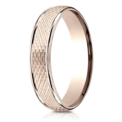 The beautiful 4.5mm wide comfort fit unisex carved wedding band features a mesh finished center with high polished round edges. This stylish wedding ring for men's and women's is long lasting and comfortable to wear everyday, made from 14k Rose Gold. Available in white gold, yellow gold and rose gold.