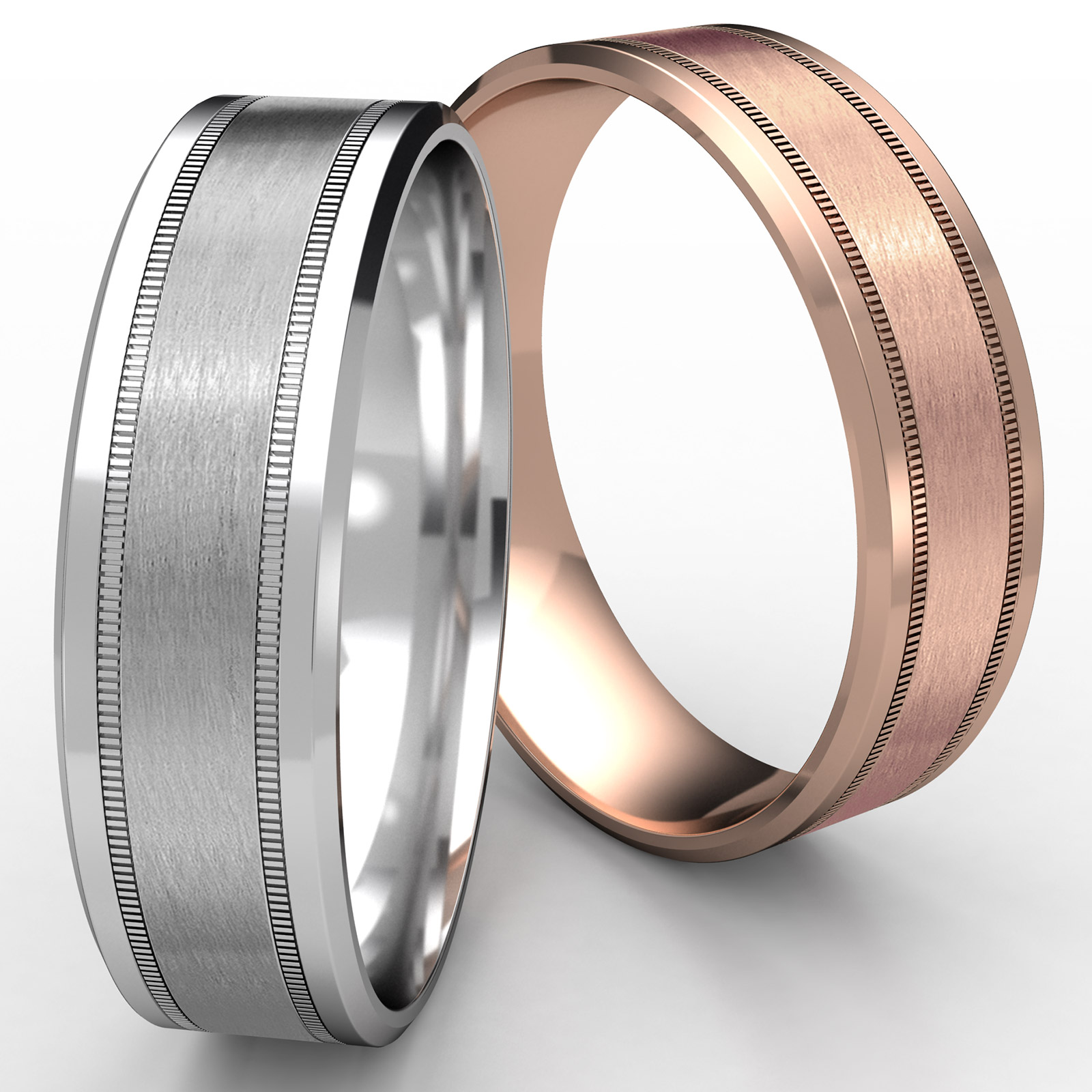 An elegant 8mm wide comfort fit carved wedding band features a satin finished center with milgrain and polished drop beveled edges. This hot wedding ring for men's is long lasting and comfortable to wear everyday, made from 14k Rose Gold. Available in white gold, yellow gold and rose gold.
