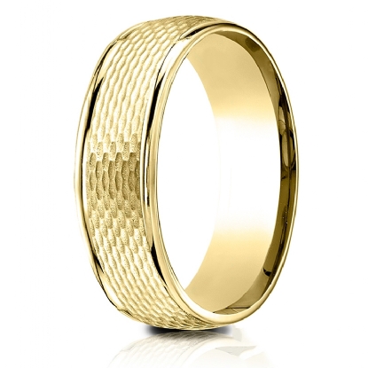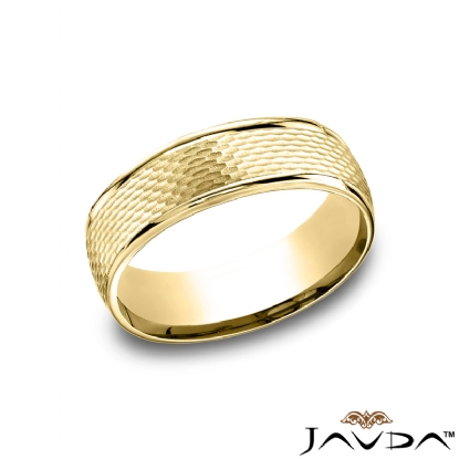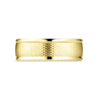 This 7.5mm wide comfort fit unisex carved wedding band features a mesh finished center with high polished round edges. This beautiful ring for men's and women's is long lasting, made from 14k Gold Yellow. The bold width and comfort fit interior creates an unique style. Available in white gold, yellow gold and rose gold.