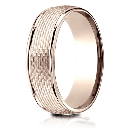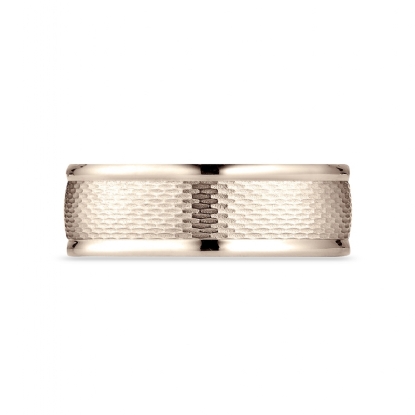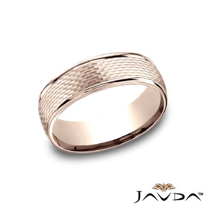 This 7.5mm wide comfort fit unisex carved wedding band features a mesh finished center with high polished round edges. This beautiful ring for men's and women's is long lasting, made from 14k Rose Gold. The bold width and comfort fit interior creates an unique style. Available in white gold, yellow gold and rose gold.