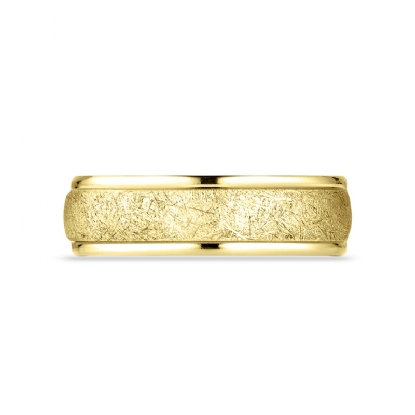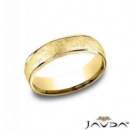 This 6.5mm wide comfort fit carved wedding band features a swirl finish center with high polished round edge for noticeable style. This solid men's wedding ring is long lasting and comfortable to wear everyday, made from 14k Gold Yellow. Available in white gold, yellow gold and rose gold.
