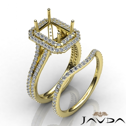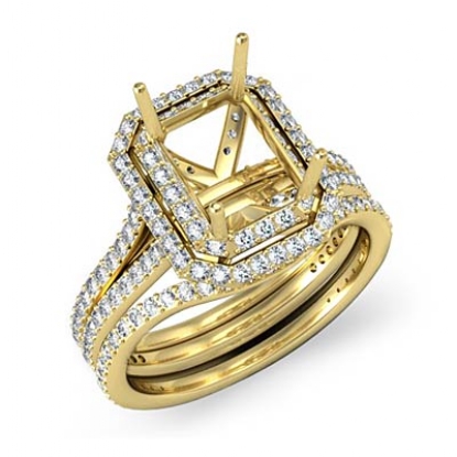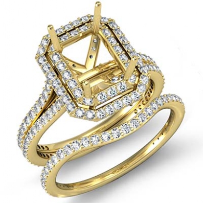 Capture your lasting love with this semi mount emerald engagement ring and matching band that features round diamonds in double halo and split shank. This bridal set is made in 14k Gold Yellow. (2.5Ct. tw.)