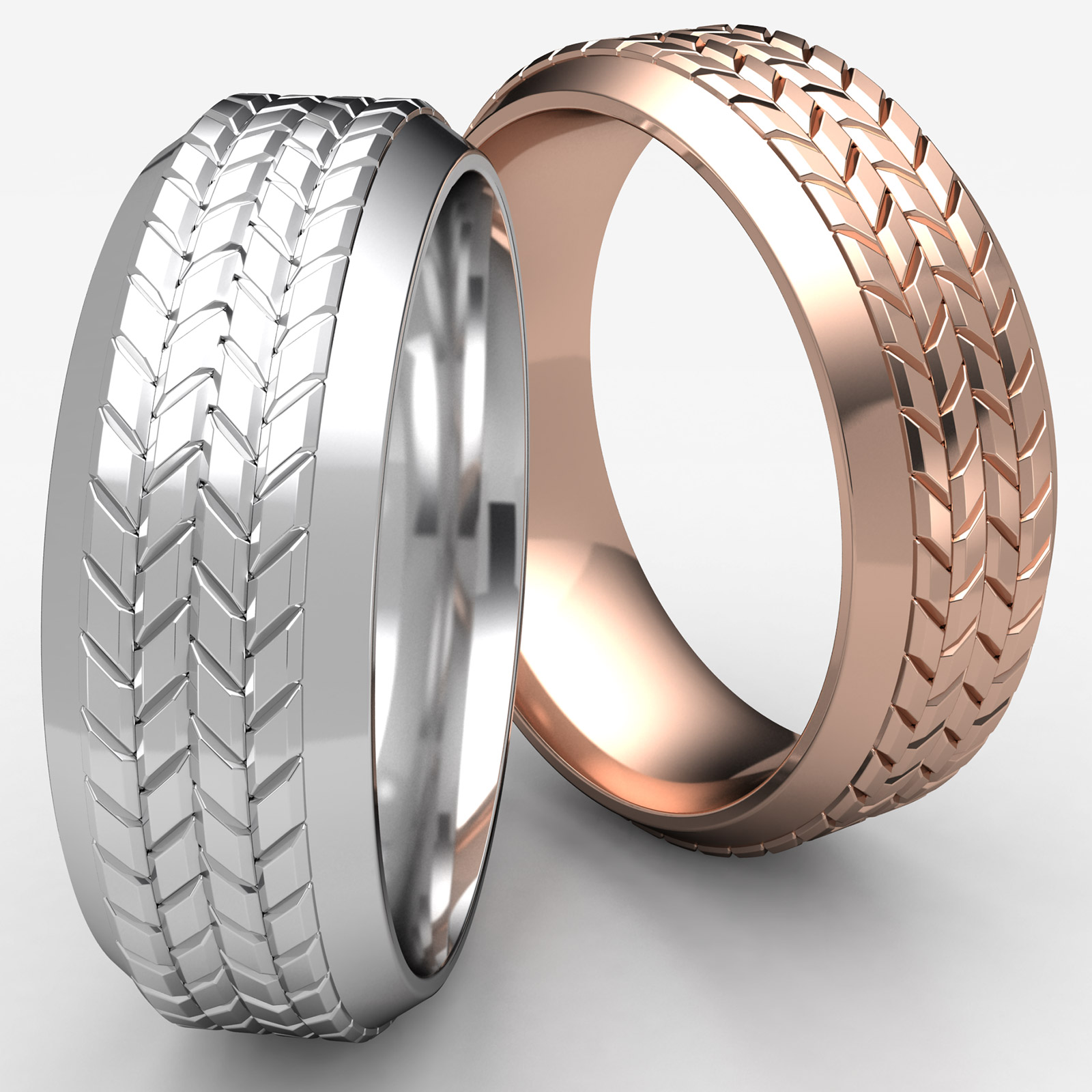 This incredible comfort fit carved wedding band features a tire tread pattern along the center with high polished beveled edge. Expertly crafted this modern ring for men's is comfortable to wear everyday. Made from 14k Rose Gold, measures 8mm wide. Available in white gold, yellow gold and rose gold.