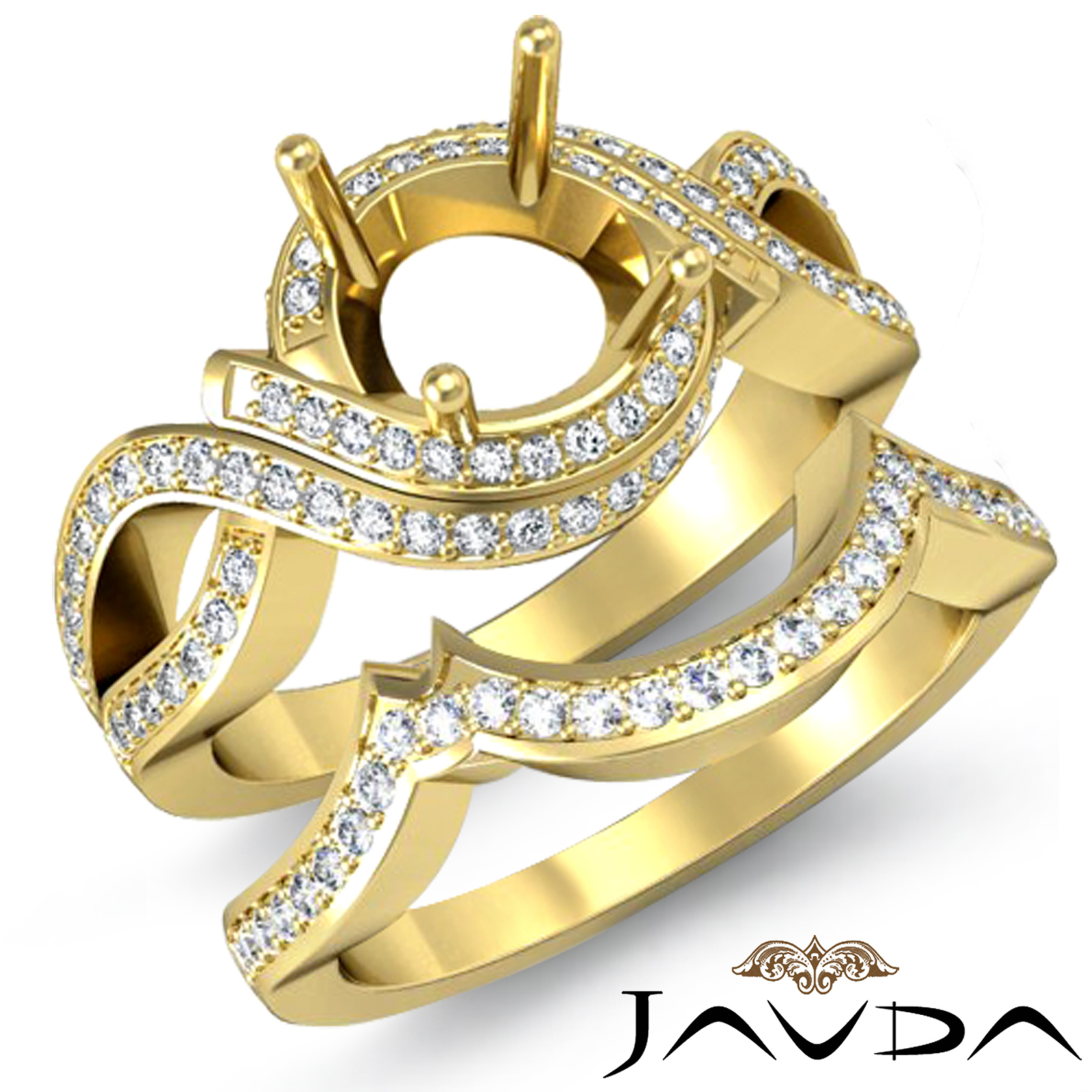 Exquisite! This round semi mount bridal set made in 14k Gold Yellow, comes with an engagement ring and matching band. It features of round pave set diamonds in a beautiful curve shank. (1.5Ct. tw.)