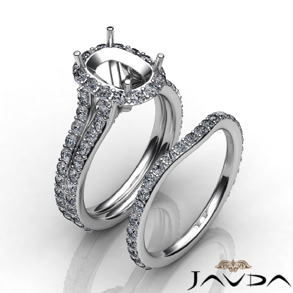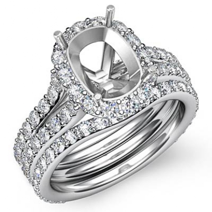 Propose to her with this semi mount cushion engagement ring and matching band that features round diamonds in halo and split shank. This bridal set is made in 18k Gold White. (1.8Ct. tw.)