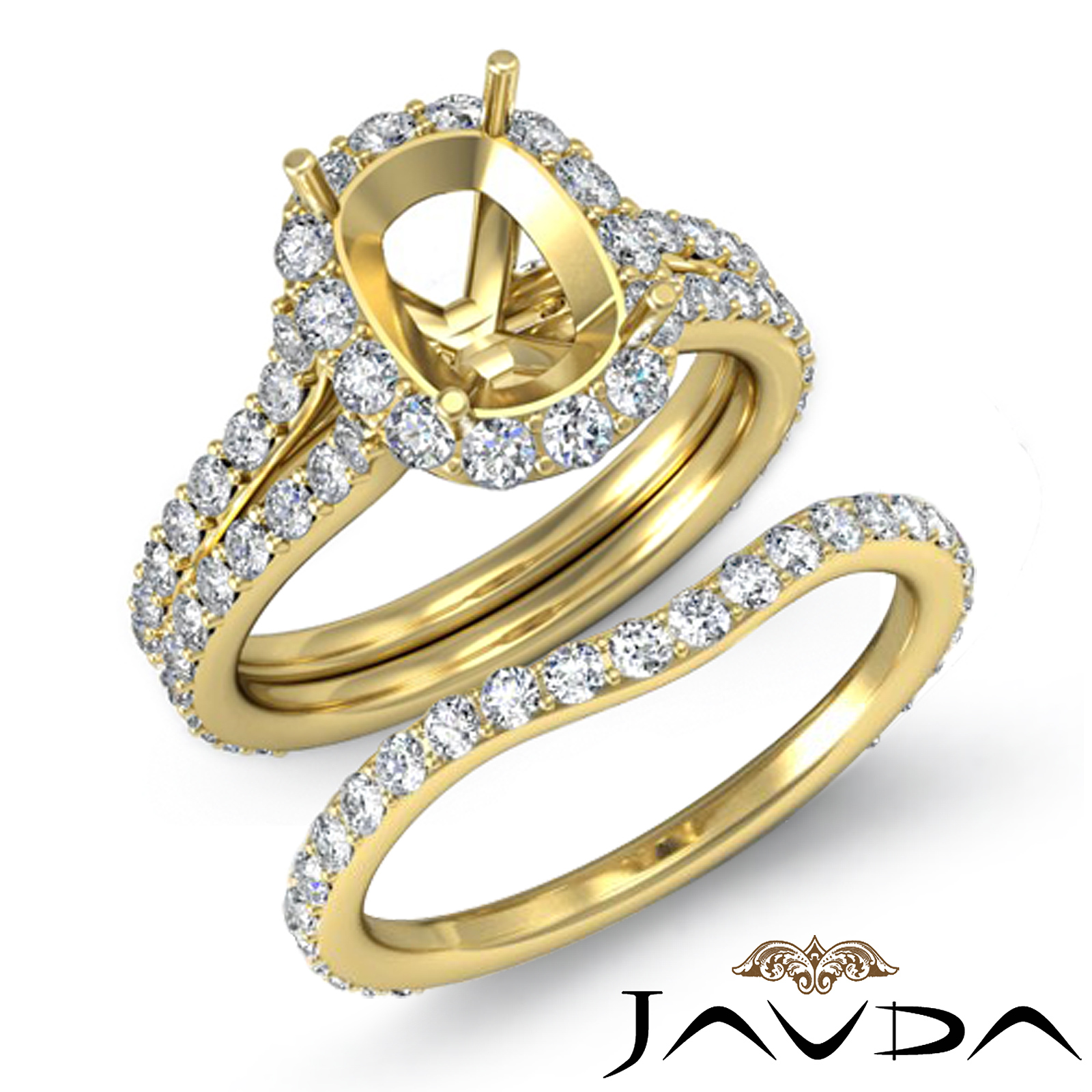 Propose to her with this semi mount cushion engagement ring and matching band that features round diamonds in halo and split shank. This bridal set is made in 18k Gold Yellow. (1.8Ct. tw.)