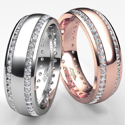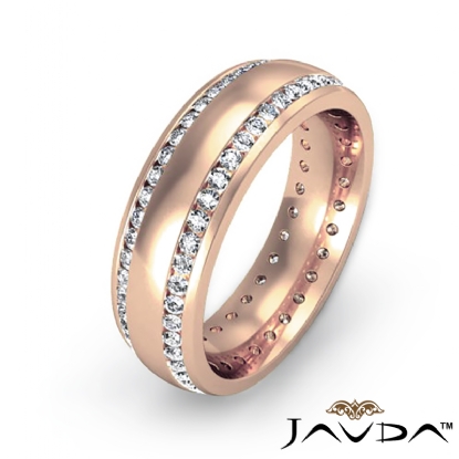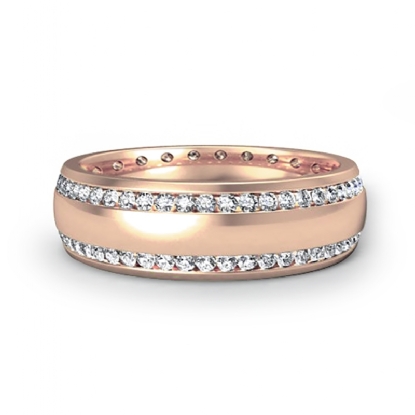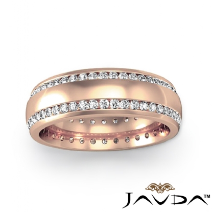 Classic and stylish dome 2 row round diamond eternity men's wedding band is made from 14k Rose Gold. Showcasing this ring polished finished dome with two row total round diamonds in a channel setting.