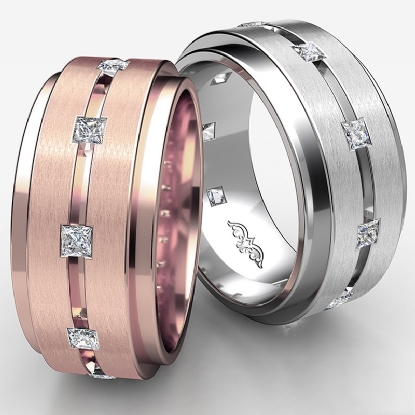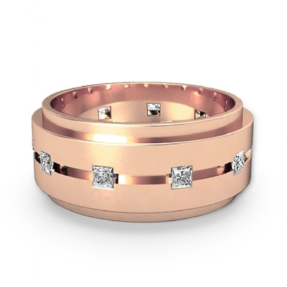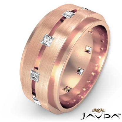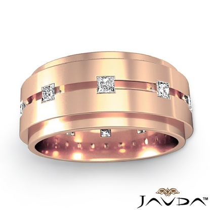 This timeless classic style polished finish princess diamond eternity men's wedding band is made from 14k Rose Gold. Featuring polished finished step edge and center horizontal grooved with princess diamonds in a bezel setting.