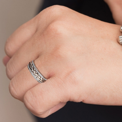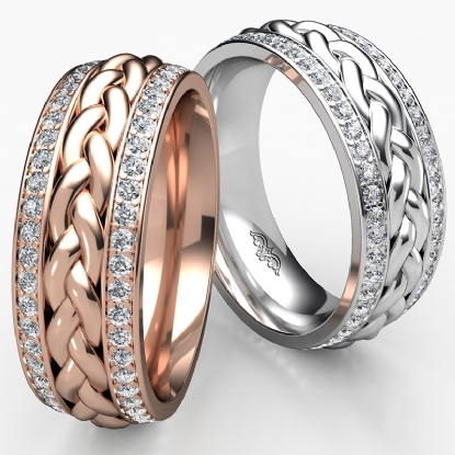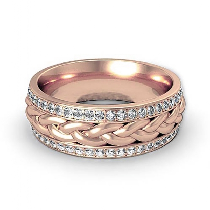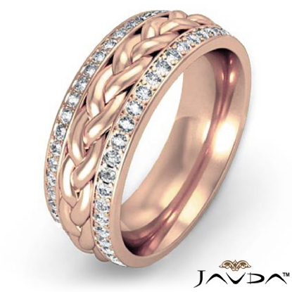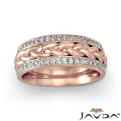 This elegant braided diamond eternity men's wedding band crafted in 14k Rose Gold. Featuring total round diamonds in a pave setting with delicately weaved braided in a center. Available in 14k & 18k white gold, yellow gold and rose gold & platinum 950. (0.57Ct. tw.)