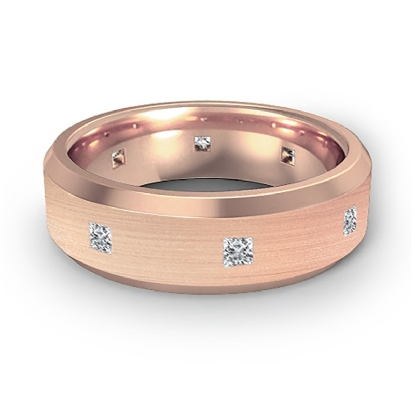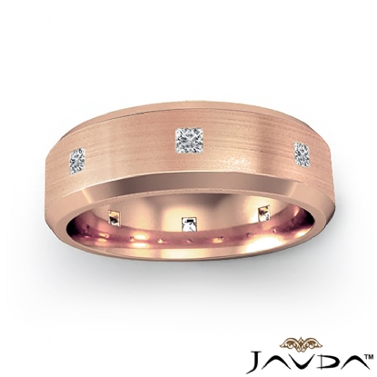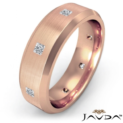 Handsome mens diamond eternity wedding band made from 14k Rose Gold. This ring features brushed finish center and polished beveled edges with total princess cut diamonds set in a bezel setting.